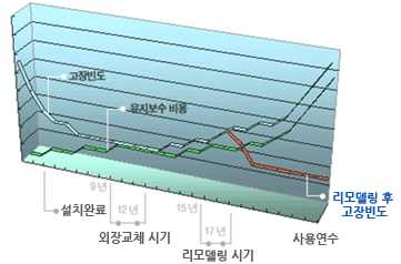 약 15~17년 경과시 유지보수 비용과 승강기 고장빈도 급격하게 증가